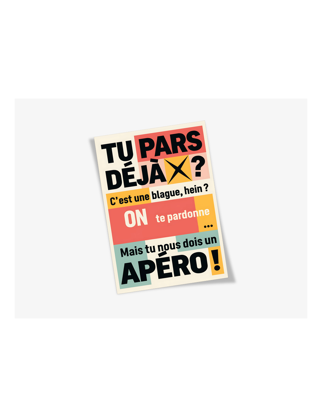 Ne laissez pas un collègue partir sans un dernier sourire ! Commandez dès maintenant votre carte "Tu Pars Déjà?" et créez un moment de partage inoubliable.