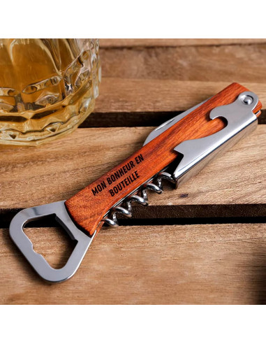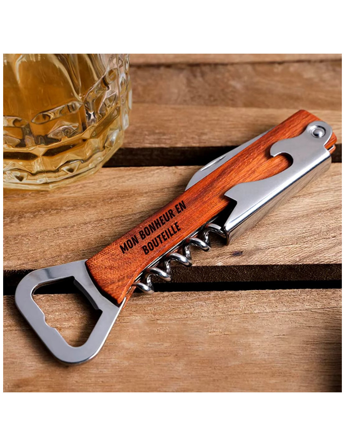 Découvrez notre tire-bouchon multifonction en acier inoxydable et bois noble, gravé avec 'Mon bonheur en bouteille'. Un accessoire élégant et pratique pour tous vos moments de dégustation.