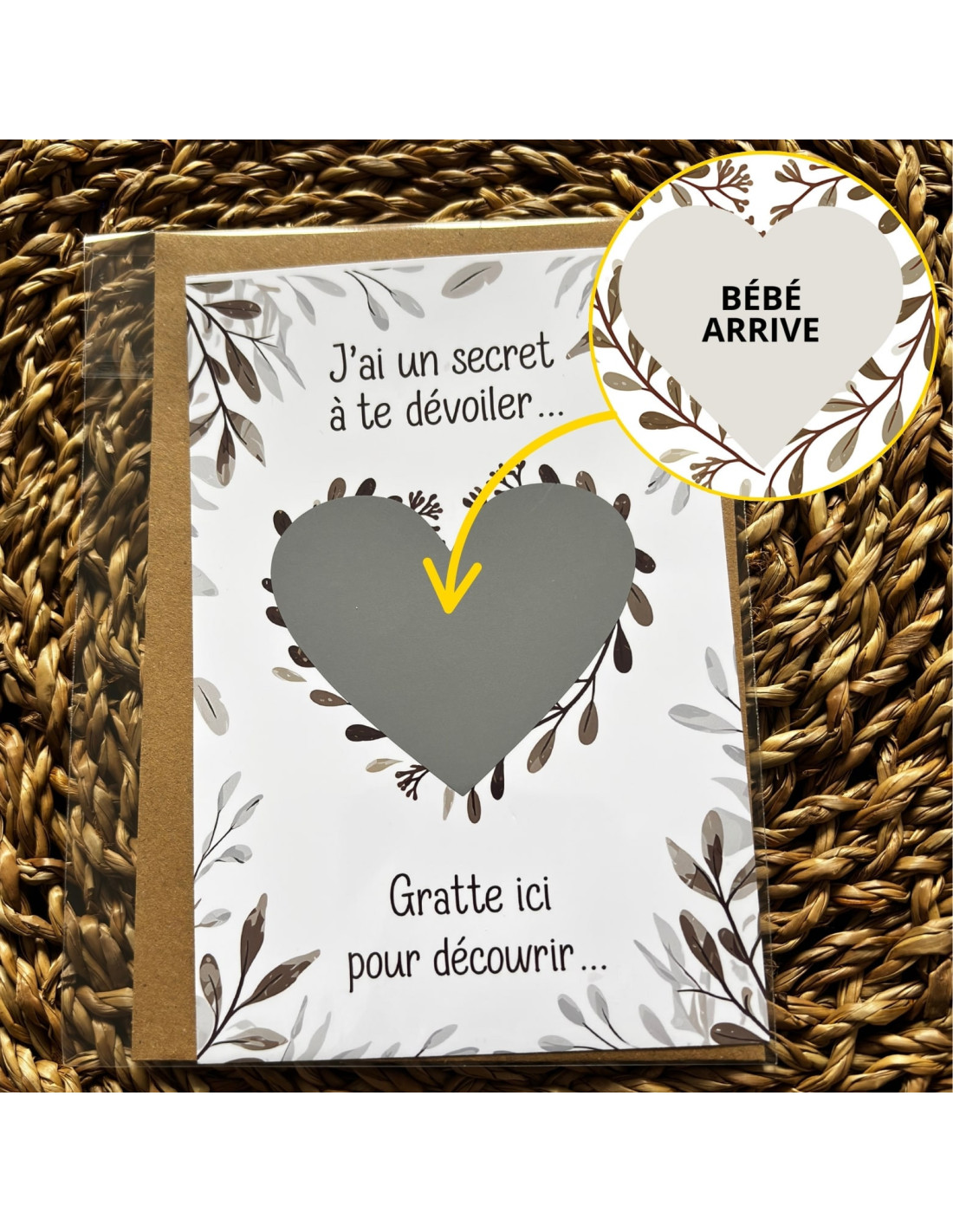 Carte à gratter “Bébé arrive” design feuillage – Annonce de grossesse élégante avec enveloppe kraft